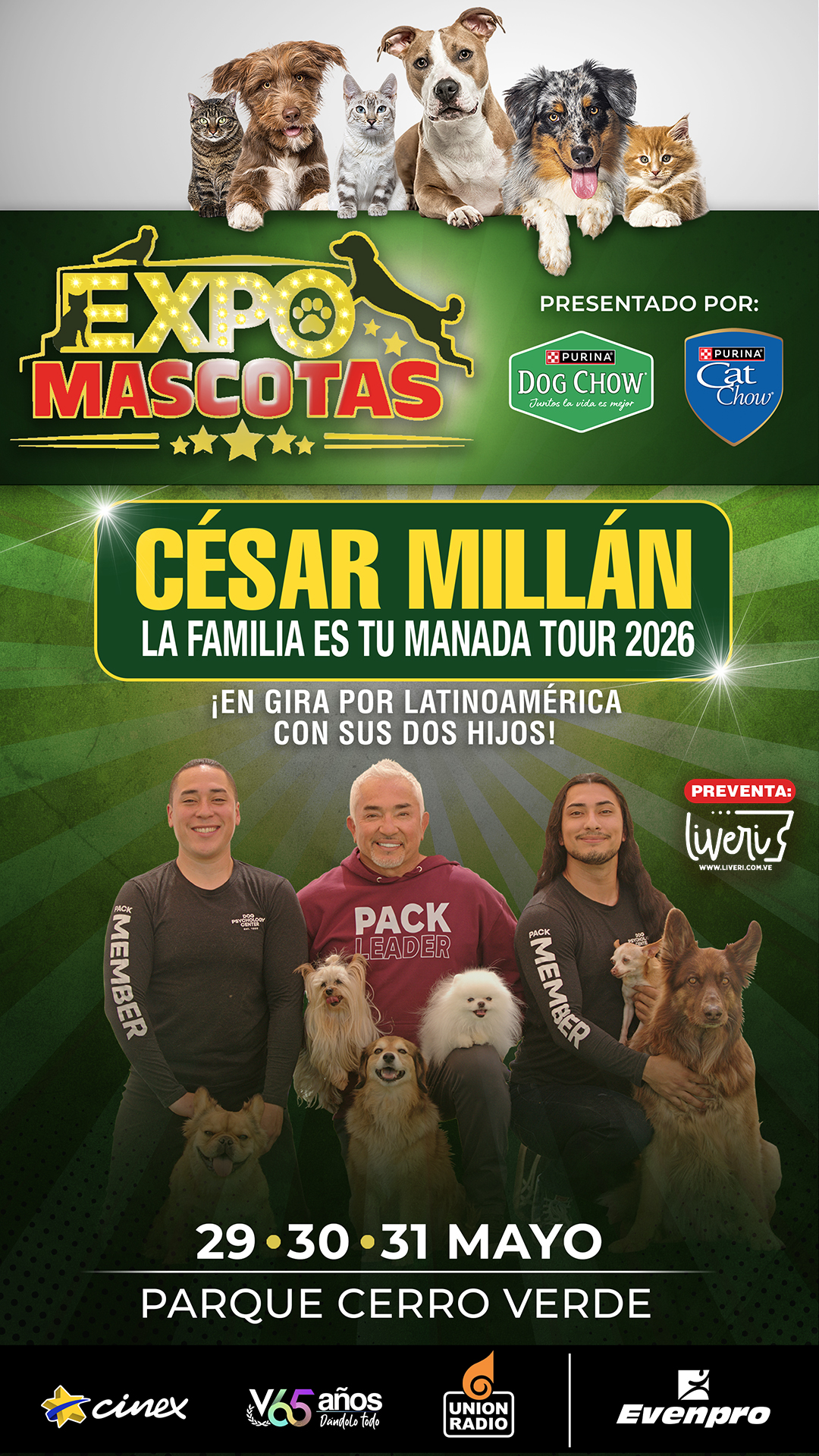 Expo Mascotas 2026, presentada por Purina y producida por Evenpro, se celebrará los días 29, 30 y 31 de mayo en Parque Cerro Verde, Caracas, y lo hará con un invitado que convierte esta primera edición en un evento histórico: César Millán.