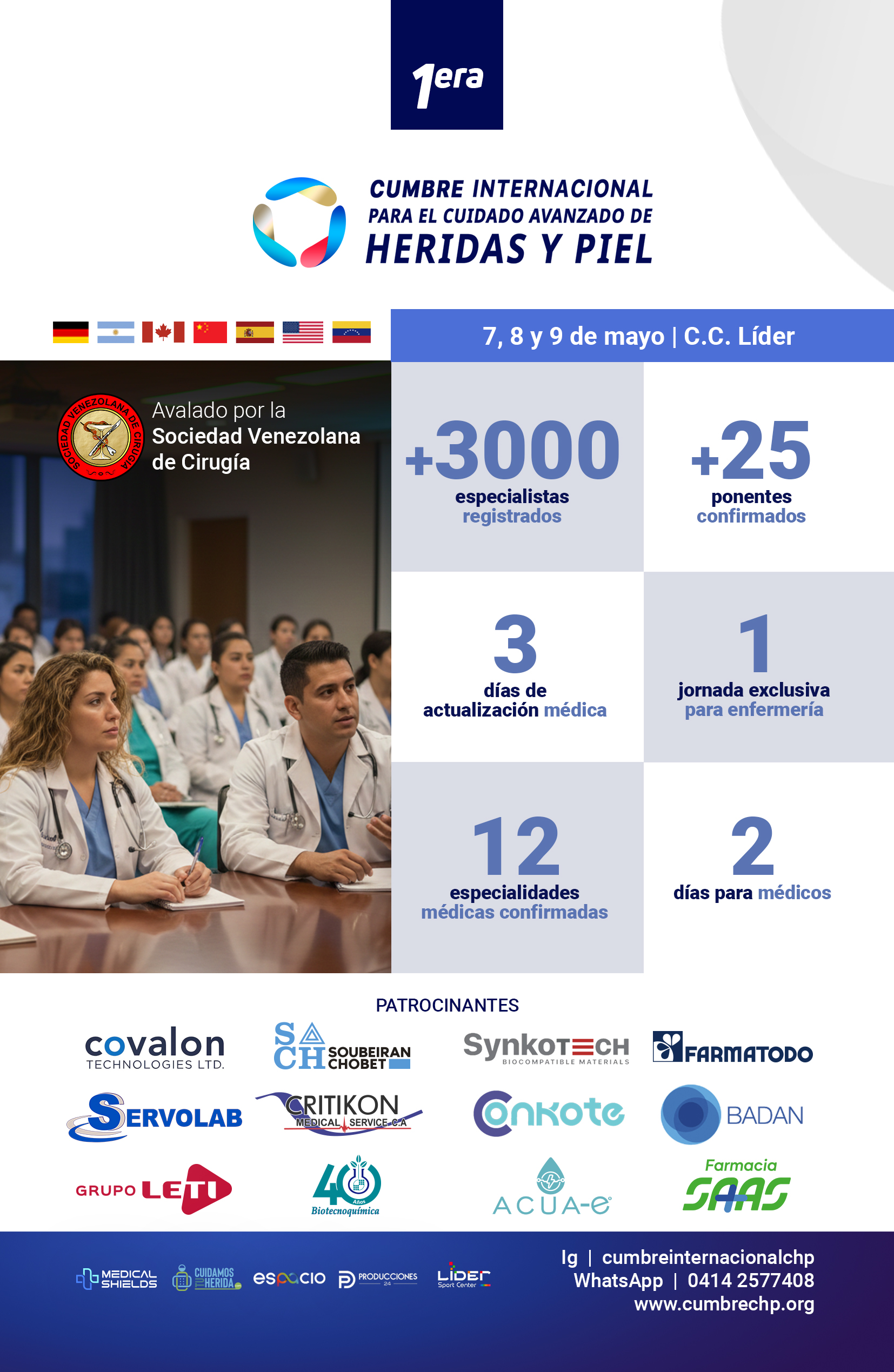 La Cumbre Internacional de Cuidado Avanzado de Heridas y Piel se consolida como un ecosistema de vanguardia donde convergen la alta tecnología y el máximo confort, creando el escenario idóneo para un intercambio de conocimientos de élite. Avalado por la Sociedad Venezolana de Cirugía y con la participación estratégica de los laboratorios y casas comerciales más influyentes del país, este evento de magnitud global trasciende las fronteras académicas para convertirse en el punto de encuentro definitivo entre el rigor científico y la innovación de la industria farmacéutica.